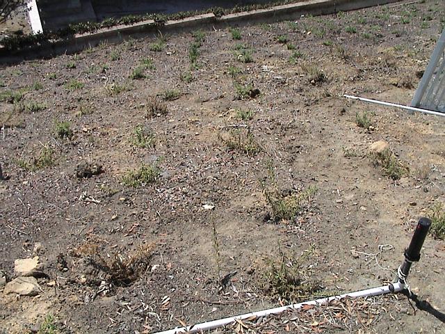 (Pictures 9 and 10) Behind the 1-story house at the end of the 3-house driveway: Newly planted myoporum are brown and dying from under-watering.